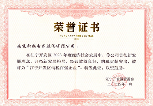近日,我公司收到江寧開發區管委會下發的2023年度“江寧開發區納稅百強企業”榮譽證書,獲此殊榮是對新聯電子經營效益以及為地方經濟建設做出貢獻...